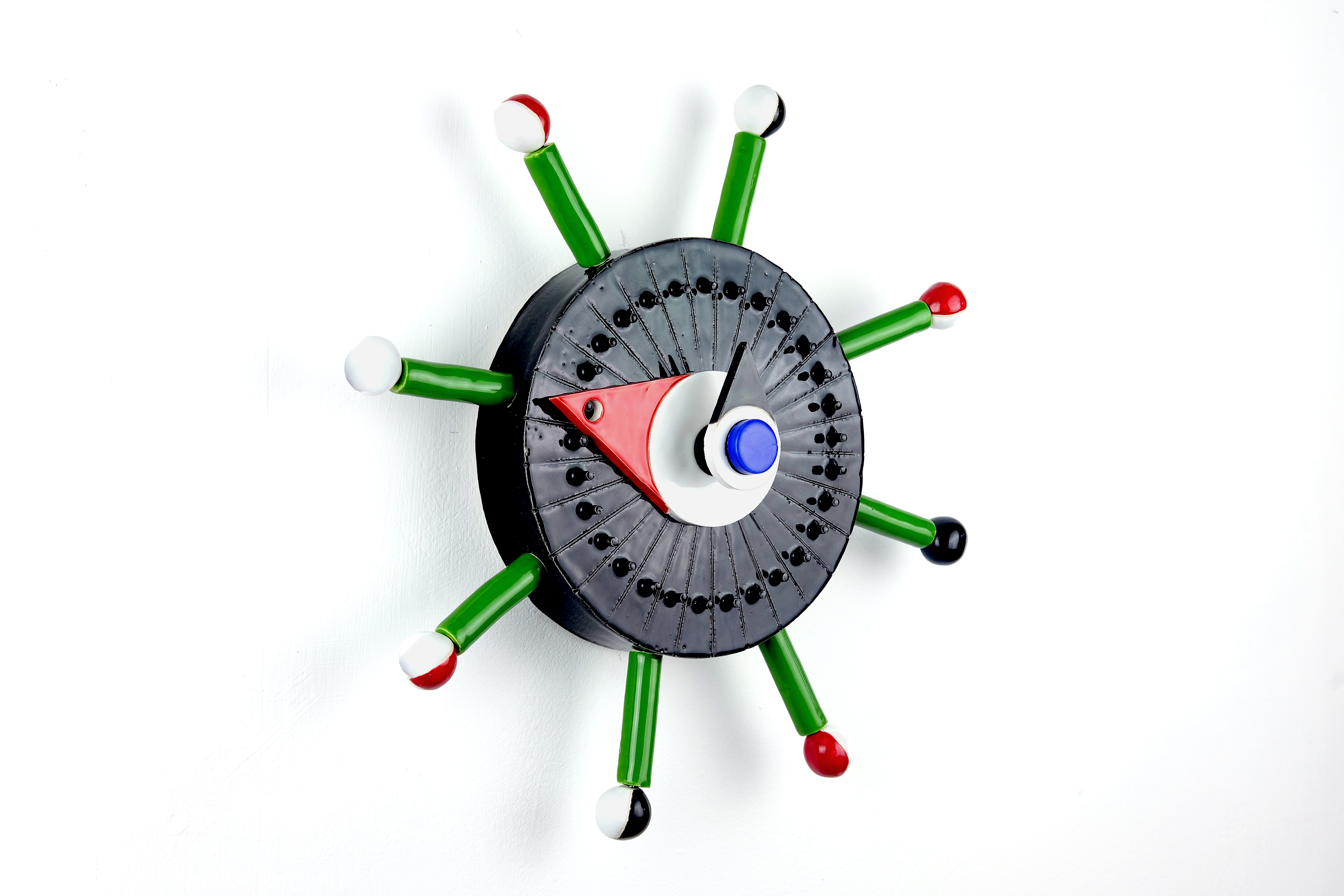 Glazed and fired ceramic with an internal stainless steel cog, and base.