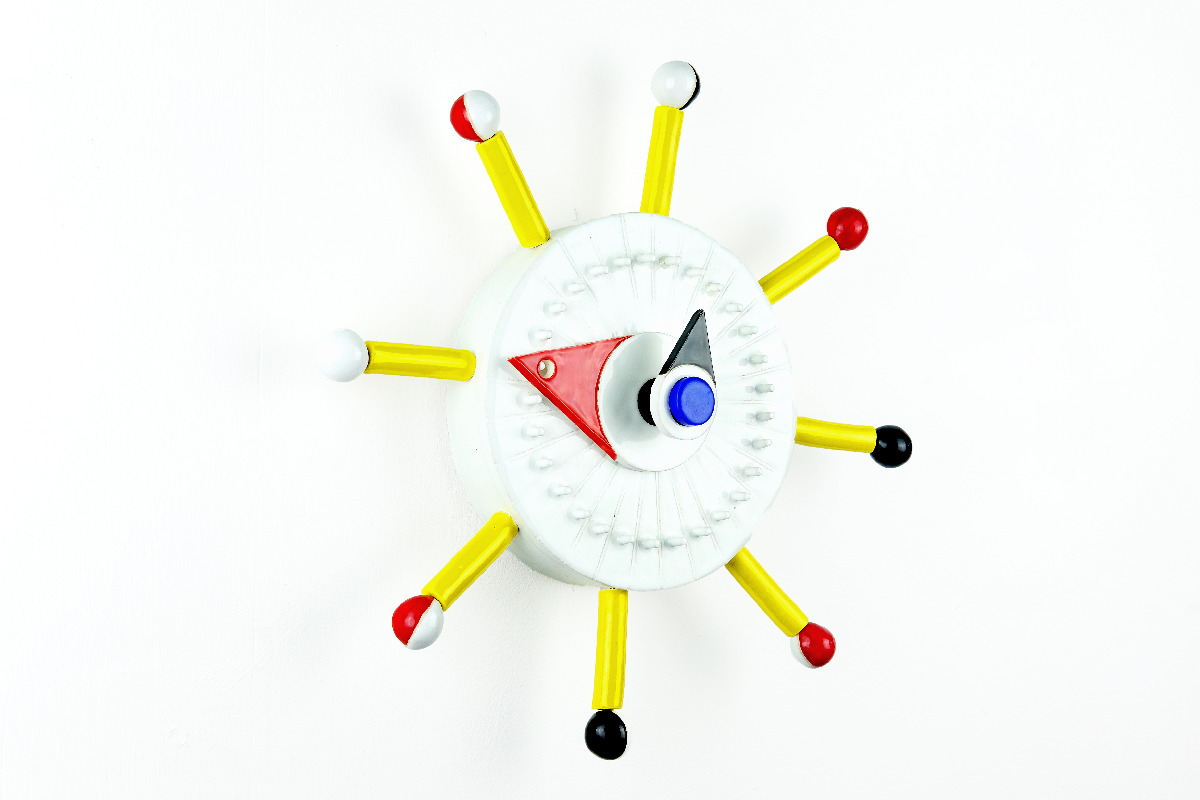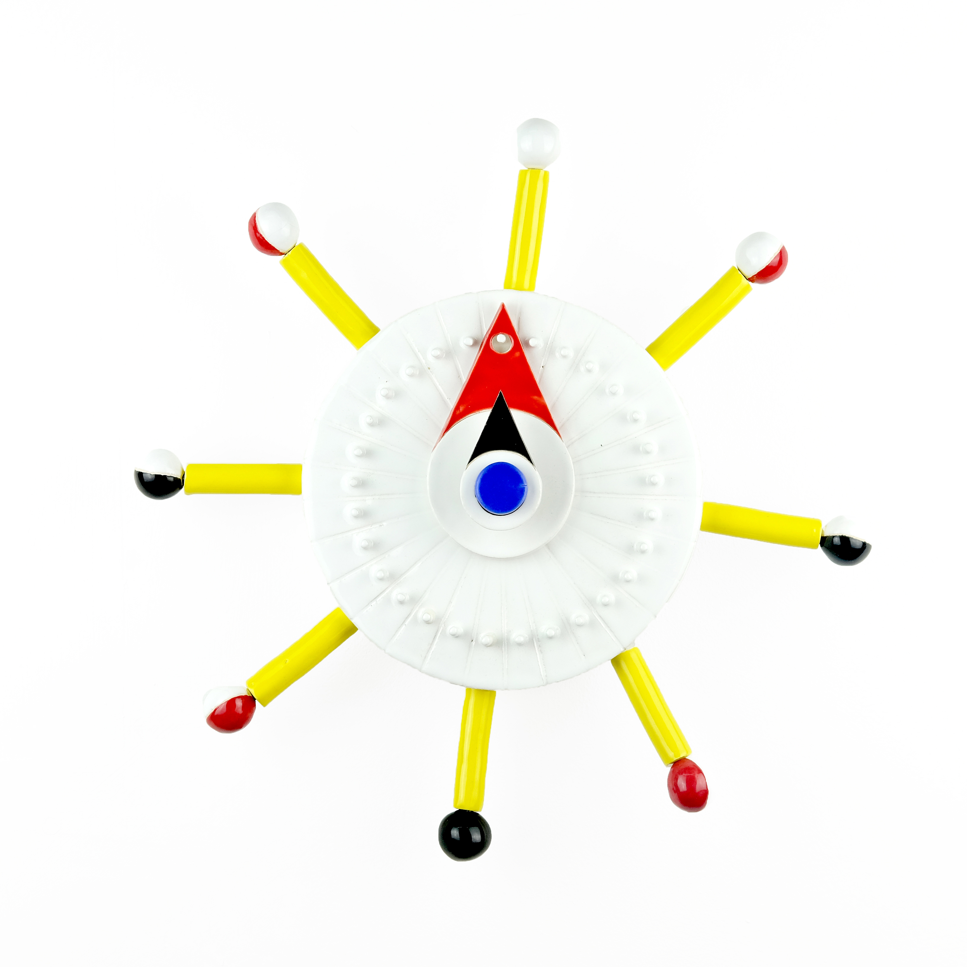 Glazed and fired ceramic with an internal stainless steel cog, and base.