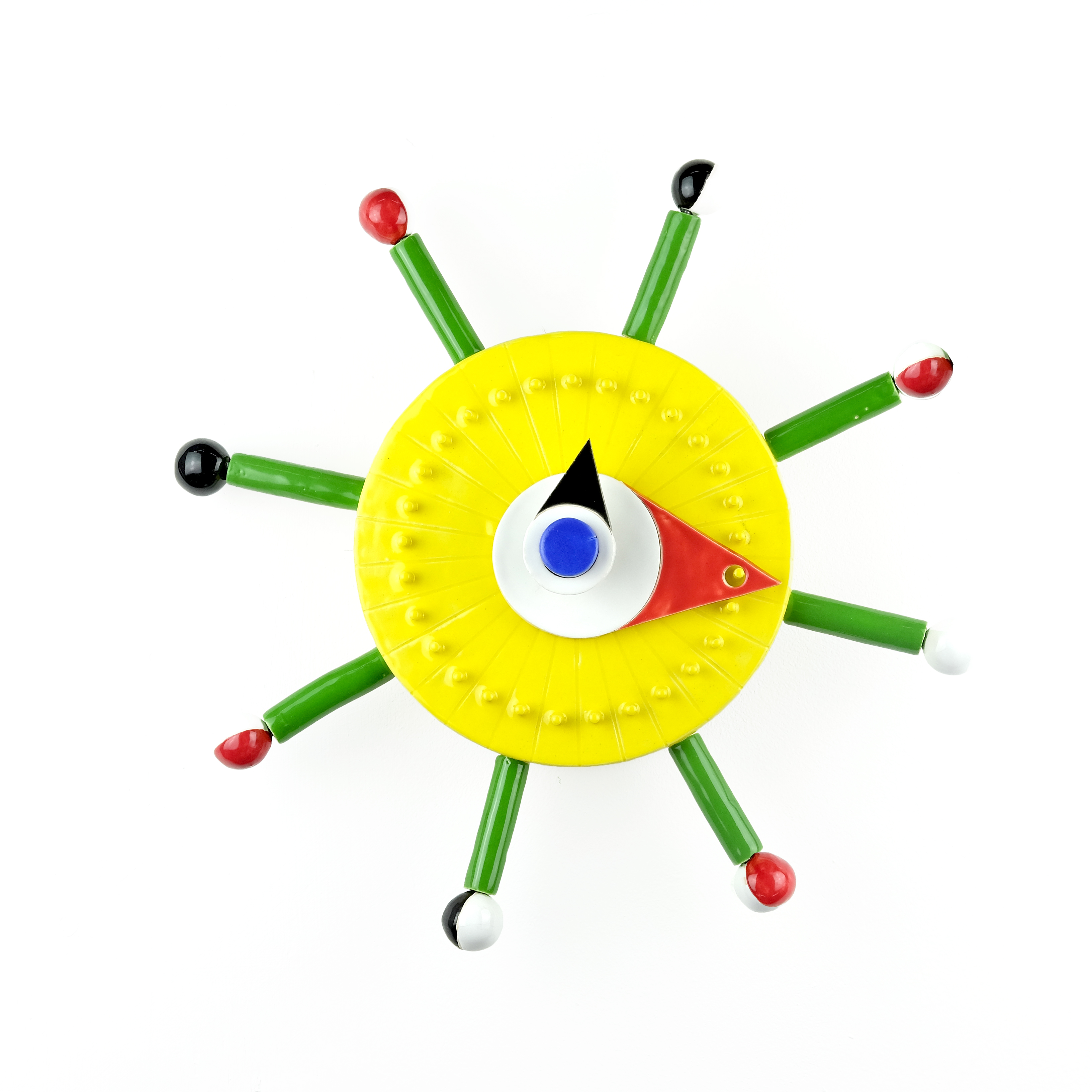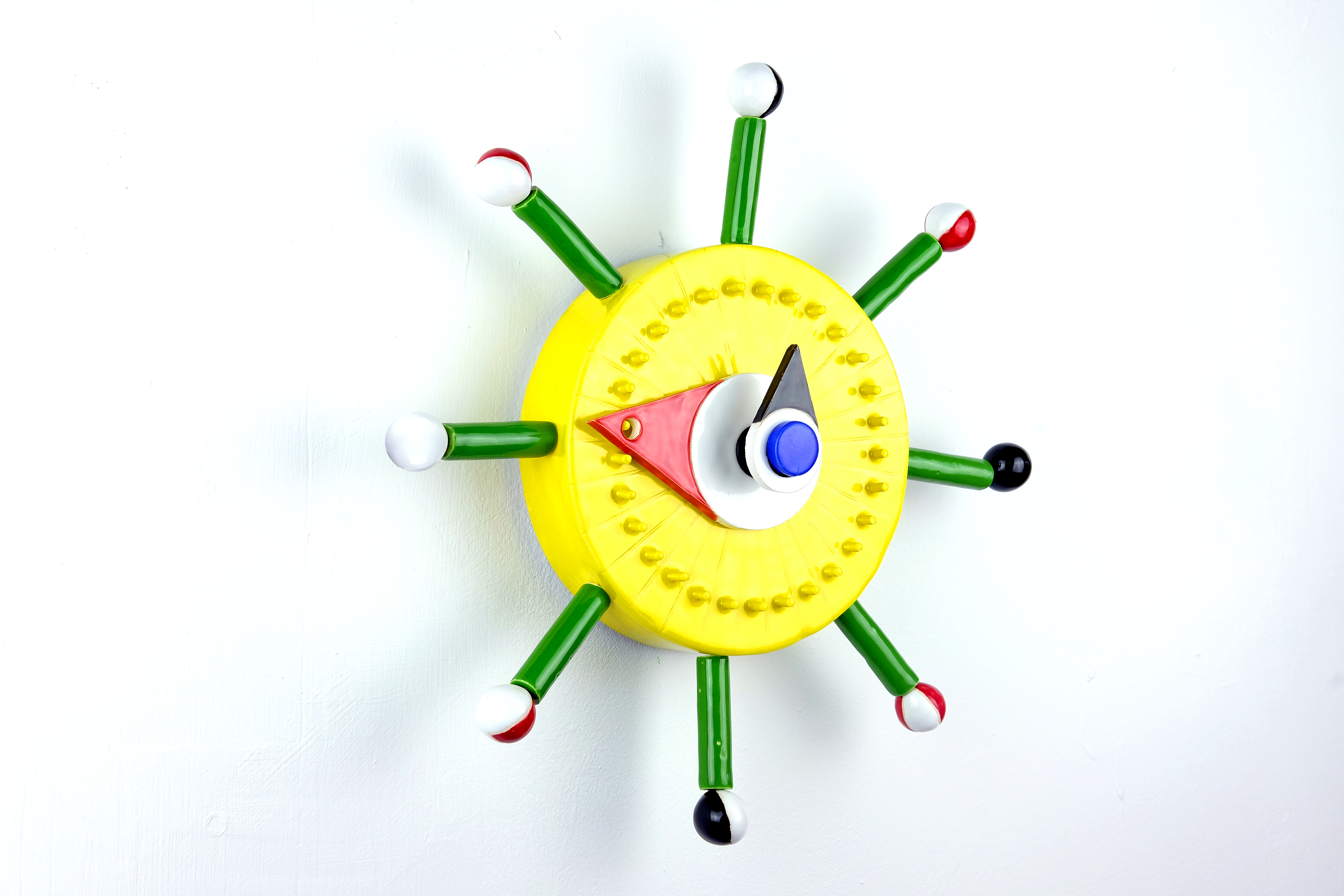 Glazed and fired ceramic with an internal stainless steel cog, and base.